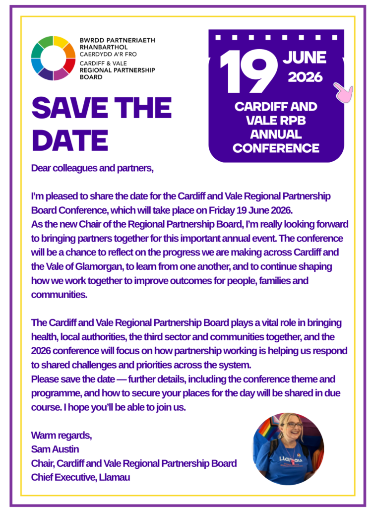 Partners across health, local authorities, the third sector and community organisations are asked to save the date for the Cardiff and Vale Regional Partnership Board Conference, which will take place on Friday 19 June 2026.