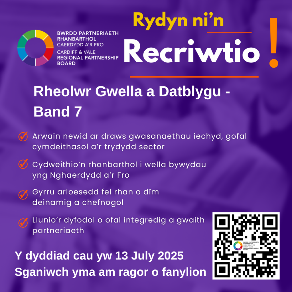 Rydyn ni’n recriwtio Rheolwr Gwella a Datblygu Band 7 i gefnogi gwaith partneriaeth ar draws iechyd, gofal cymdeithasol a’r trydydd sector.